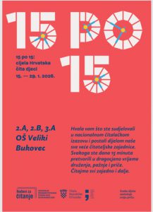 Učenici 2.A, 2.B i 3.A razreda zajedno sa svojim učiteljicama uključili su se izazov „15 po 15: cijela Hrvatska čita djeci”. Svakodnevno su čitali vodili Dnevnik čitanja: 15 dana po 15 minuta. Otkrili su da u školskoj knjižnici ima mnoštvo zanimljivih knjiga i slikovnica. Nismo stali na tom izazovu.